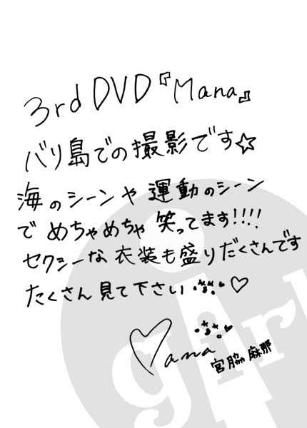 麻那ちゃん。時折見せるとびっきりの笑顔、弾ける仕草のギャップもたまりません。 将来大物女優の風格漂う麻那ちゃんから目が離せない! | |||